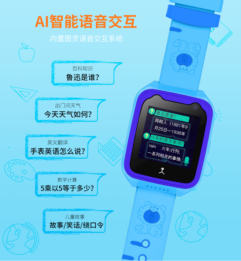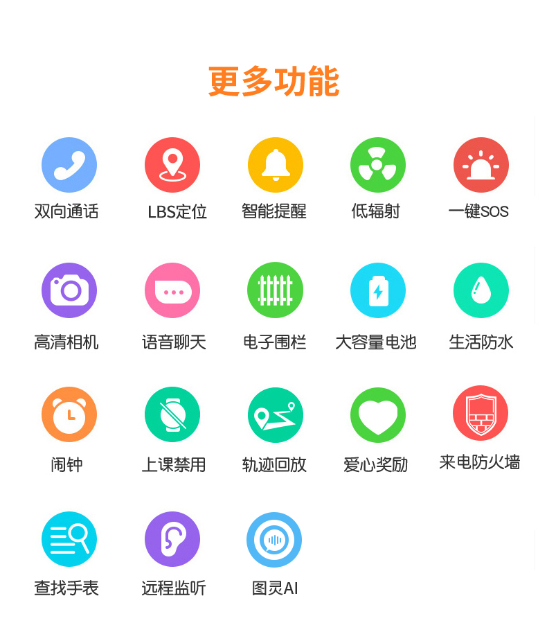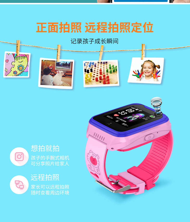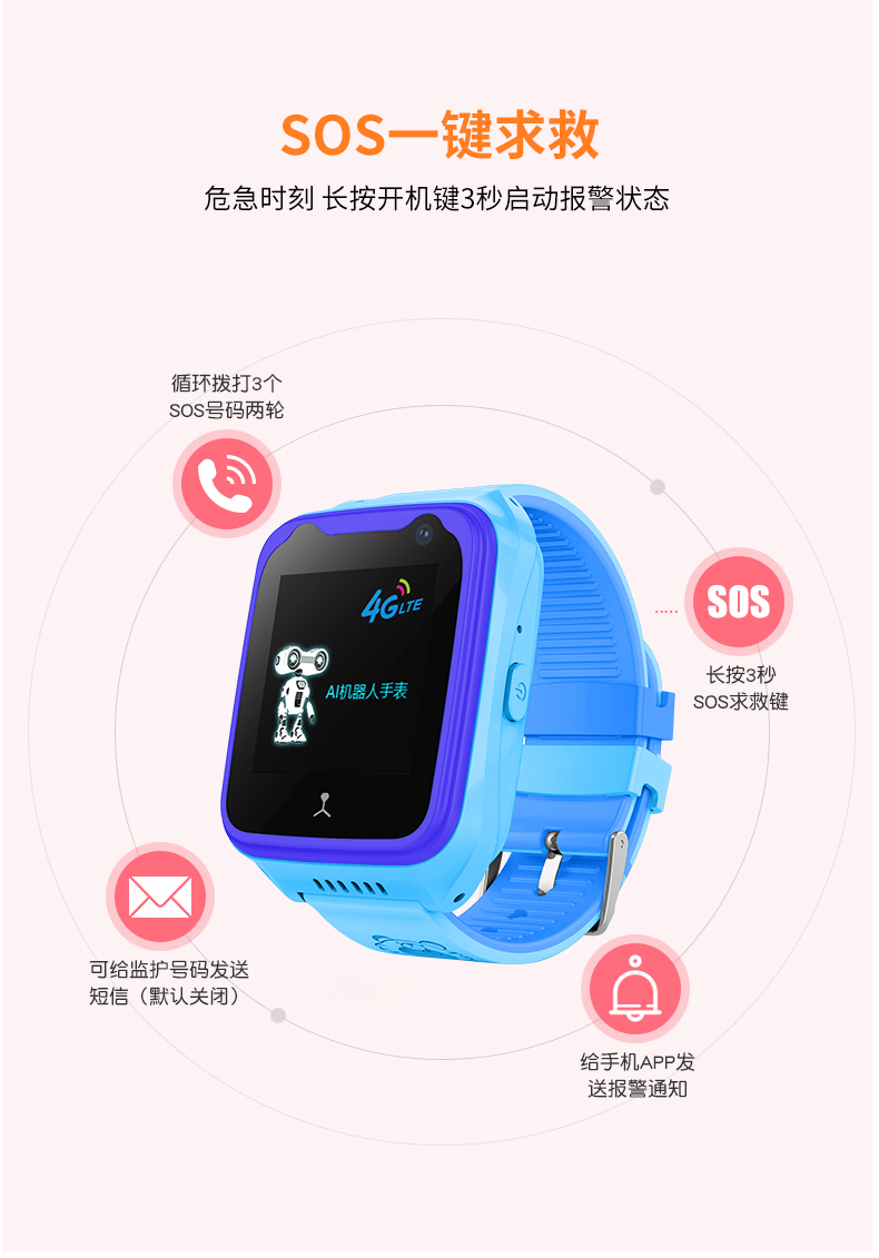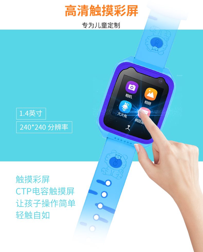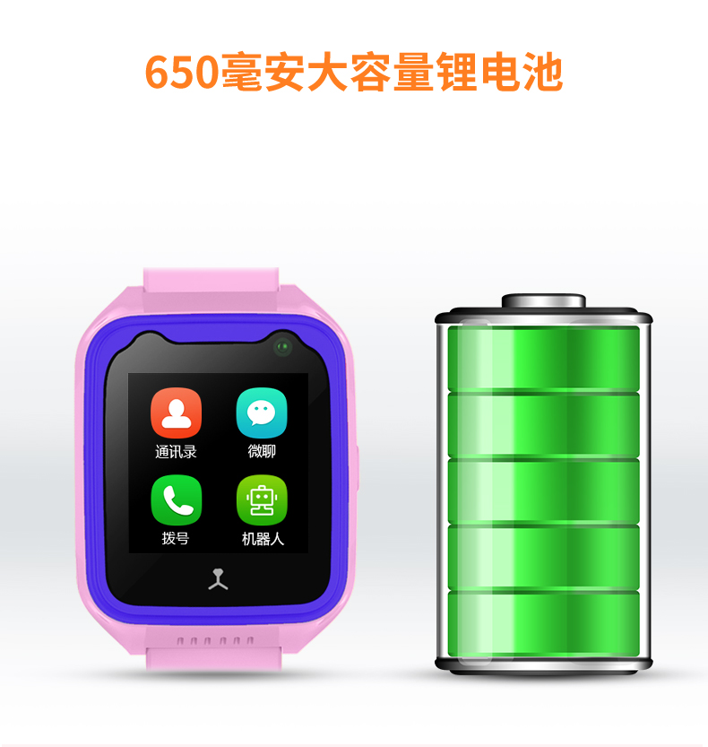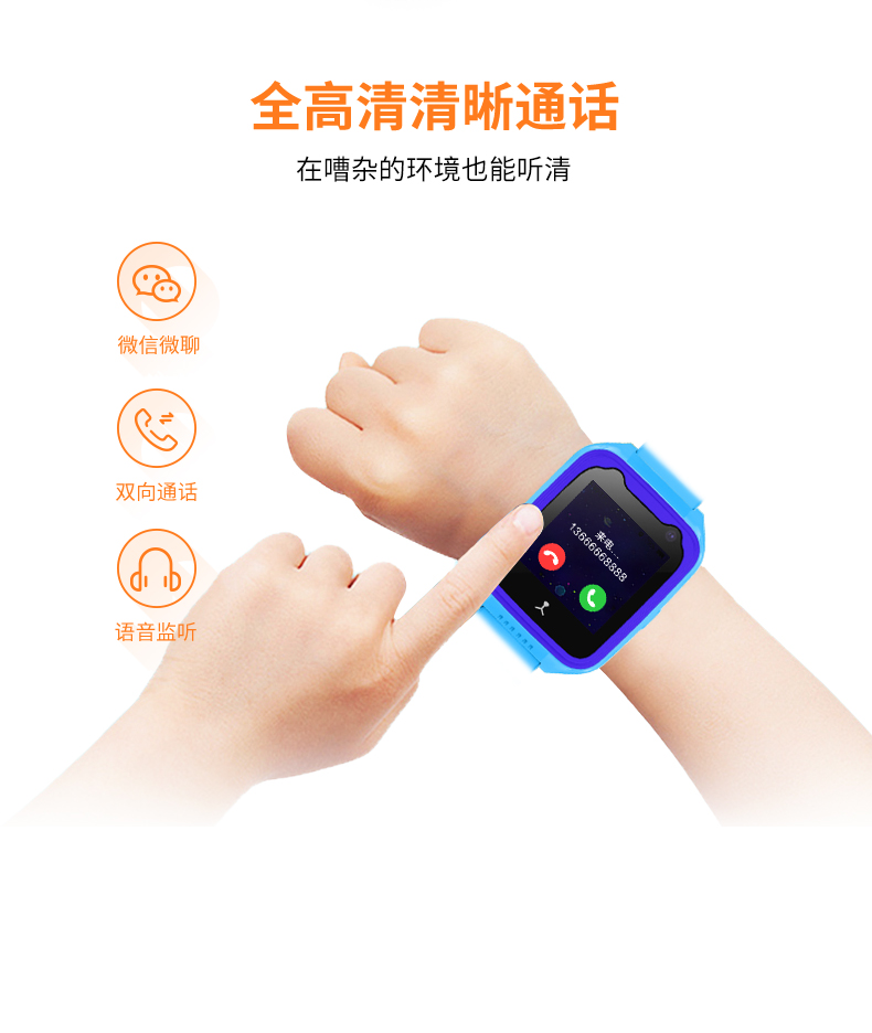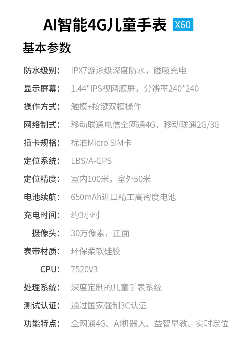 防水级别:IPX7游泳级深度防水,磁吸充电 显示屏幕:1.44"IPS视网膜屏,分辨率240*240 操作方式:触摸+按键双模操作 网络制式:移动联通电信全网通4G,移动联通2G/3G 插卡规格:标准Micro SIM卡 定位系统:LBS/A-GPS 定位精度:室内100米,室外50米 电池续航:650mAh进口精工高密度电池 充电时间:约3小时 摄像头:30万像素,正面 表带材质:环保柔软硅胶 CPU:7520V3 处理系统:深度定制的儿童手表系统 测试认证:通过国家强制3C认证 功能特点:全网通4G、AI机器人、益智早教、实时定位 |
